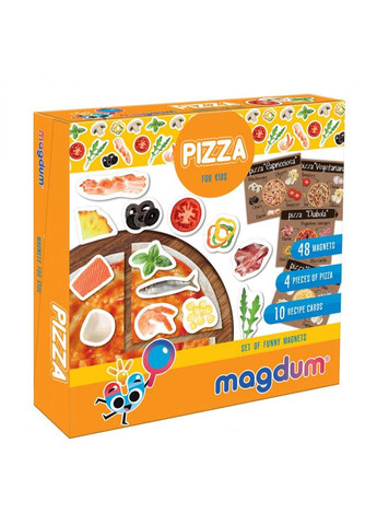 Стань шеф-кухарем або офіціантом! Готуй піцу або приймає замовлення! Все це можна з магнітною грою Піца від ТМ MAGDUM.В зручною яскравою коробці ви знайдете: • 48 магнітних інгредієнтів для кулінарного шедевра; • 4 магнітні основи-шматочка для піци, зібравши їх разом, виходить повноцінна кругла піца; • 10 фоторецептів найпопулярніших піц світу. Всі деталі гри щільні, міцні і безпечні для дитини. Магніти добре тримаються на шматочках-основах, в той же час їх легко змінювати і пересувати.