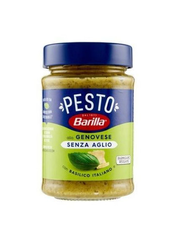 Genovese senza aglio (Песті алла Дженовізе сінця агліо) ТМ Barilla (Барилла) – це один з популярних італійських соусів, приготований на основі базиліка та оливкової олії з додаванням традиційного італійського сиру Пармезан та волоських горіхів. Пармезан - твердий ароматний сир з тонкою гіркуватістю і тривалим післясмаком. Соус можна додати до пасти або спагетті. Соус з сиром Пармезан та горіхами стане відмінним доповненням до м'ясних страв, піци та овочевих запіканок. Формат поставки - скляна банка вагою 190 г, яка зберігає свіжість та смакові якості продукту.