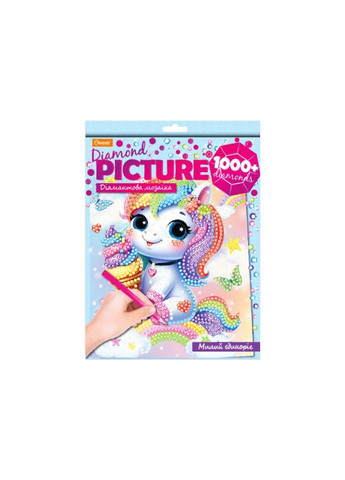 Діамантова мозаїка — це захопливий вид творчості, який дозволяє створити яскраву та об’ємну картину власноруч. Процес полягає в тому, щоб викладати маленькі декоративні «діамантики» на клейову основу за схемою. Завдяки блискучим стразам зображення набуває ефекту мерехтіння та виглядає дуже декоративно. Така творчість розвиває уважність, посидючість, дрібну моторику та допомагає зняти стрес. Готова робота стане прекрасною прикрасою інтер’єру або чудовим подарунком. - картинка для декорації діамантами 200×250 мм (картон кашований, друк із флуоресцентними фарбами, клейовий шар для декоративних діамантів, покритий захисною плівкою) - 1 шт; - декоративні діаманти різних кольорів (кожен колір в окремому пакетику); - стілус - 1 шт; - квадратик з клейкою масою для стілусу - 1 шт; - пластмасовий лоток для сортування декоративних діамантиків; - паперова інструкція – 1 шт.