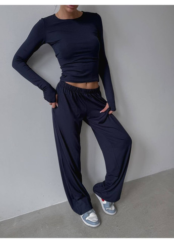Спортивний костюм виготовлений з турецького куліра, з високим вмістом бавовни та з легкої двунитки. Тканини мають середню розтяжність, враховуйте це під час підбору розміру. Завдяки своєму оверсайз фасону гарно сідає по фігурі. Футболка з короткими рукавами довжиною до ліктя. Плечовий шов спущений, завдяки цьому створюється вільний силует. Спереду присутня термоналіпка LA. Штани фасону палаццо з високою посадкою без манжетів, талія на гумці без застібок. На штанах присутні дві кишені з відрізним бочком.