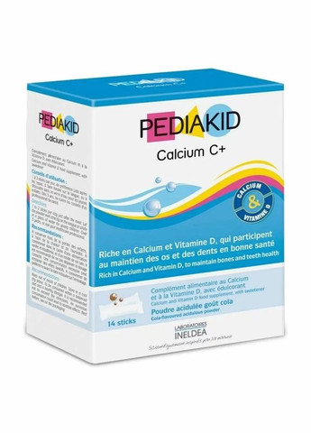 Calcium C + Pediakid - це продукт, який забезпечить вашої дитини добовою нормою кальцію і вітаміну Д. Для того, щоб забезпечити міцність кісток і зубів споживання кальцію і вітаміну D необхідні. Pediakid кальцію C + являє собою 14 палочок зі смаком коли для здоров"я кісток і зубів. Продукт, зокрема, розроблений для щоденного споживання кальцію і вітаміну D і сприяє повному засвоєнню одного і іншого. Паличка розтане під язиком або її можна розвести в склянці води. Цей продукт підходить для дітей з непереносимістю лактози або алергією на молоко. Спосіб вживання: 1 - 2 палички в день, відразу після їжі. Можна розплавити на язиці або розчинити в склянці води для дітей молодшого віку. Від 3-х років. Також підходить для дітей після 15 років. Підтримка міцних кісток і здорових зубів. Інгредієнти: карбонат кальцію (кукурудзяний крохмаль), ксиліт, фруктоза, лимонна кислота, діоксид кремнію, гліцерил бегенат, аромат (мальтодекстрин, гуміарабік, триацетин, мальтол, бутилгідроксіанізол) бікарбонат натрію, вітамін D3 (модифікований крохмаль, мальтодекстрин, рапсове масло: аскорбат натрію , токоферол: антиоксиданти).