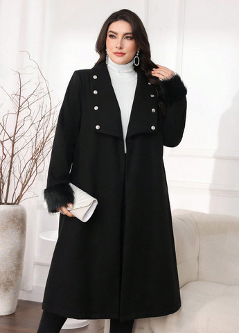 Колір Чорний / Сезонність Зима / Тип Без наповнювача / Стиль Кежуал / Декор Гудзики, Хутро / Матеріал верху Поліестер / Бренд SHEIN / Візерунок Однотонний / Довжина виробу Довге / Довжина рукава Довгий