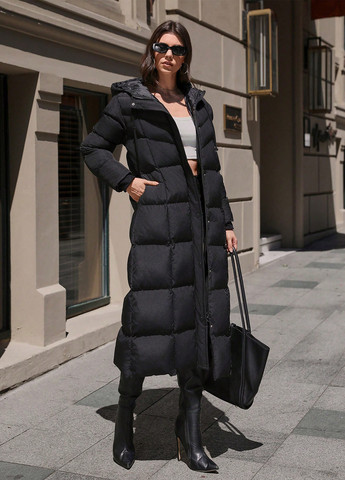 Куртка-пальто жіноча стьобана. Виготовлена із якісної плащової тканини "Лаке", що забезпечує водовідштовхувальні властивості, захист від вітру та стильний блискучий зовнішній вигляд. Утеплювач — синтепон 200 г/м², що робить модель дуже теплою та придатною для зимового сезону. Присутня якісна підкладка. Стильна зимова куртка-пальто вільного крою. Завдяки стьобаному дизайну та продуманому фасону, куртка красиво сідає по фігурі і не сковує рухів. Високий комір та об'ємний каптур надійно захищають від вітру та холоду. Застібається на якісну тракторну блискавку.