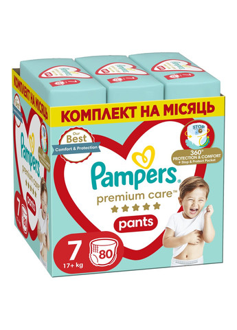 Підгузки-трусики Pampers (Памперс) Premium Care Pants забезпечують надійний захист, навіть коли Ваш малюк активно рухається. Для Pampers безпека вашої дитини завжди стоїть на першому місці. Трусики Pampers Premium Care пройшли дерматологічні випробування та не містять алергенів, зазначених у списку парфумерних алергенів ЄС (відповідно до Регламенту ЄС № 1223/2009 про косметичні засоби). Вони були схвалені дерматологами Skin Health Alliance (Скін Хелс Альянс), а також протестовані та сертифіковані відповідно до стандарту Standard 100 OEKO-TEX. Основні переваги: виготовлені із надм'яких та еластичних матеріалів забезпечують комфортну посадку та надійний захист при будь-яких рухах надзвичайно м'який еластичний поясок по всій ширині підгузка повторює форми тіла малюка миттєво вбираючий рідину суперпоглинаючий внутрішній шар і кишенька гарантують відсутність протікання ззаду забезпечують всебічний захист від протікань до 12 годин легка зміна підгузків одним рухом Як одягати підгузки-трусики: розтягніть, вставте руки в трусики знизу і потягніть у різні боки. Надягніть, просуньте ніжки малюка всередину і підтягніть трусики вище. Як знімати підгузки-трусики: розірвіть боковинки та зніміть підгузок з дитини. Згорніть трусики, заклеївши їх липучкою. Викиньте за допомогою стрічки-утилізатора. Характеристики Кількість: 80 шт. Розмір: 7 (17+ кг) Виробник: Pampers, Польща.