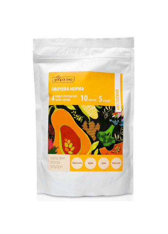 ОВОЧНА НОРМА - ФОРМУЛА ЗДОРОВОГО ХАРЧУВАННЯ. 10 ОВОЧІВ + 5 СПЕЦІЙ + 4 ВИДИ ПРОРОЩЕНИХ ЗЕРЕН ЗЛАКІВ. Сучасна формула продукту на основі гарбуза, топінамбуру, артишоку, шпинату, броколі та кращого рослинного провідника із злакових пророщених зерен для здорового травлення. ЗАГАЛЬНА ДІЯ: Стимулює обмін речовин Має потужну антиоксидантну дію. Сприяє здоровому схудненню Насичує організм вітамінами, мінералами, клітковиною Нормалізує функціонування шлунково-кишкового тракту. Підвищує розумову та фізичну витривалість. ПОВНИЙ СКЛАД: Пророщені зерна пшениці, вівса, ячменю, кукурудзи; люцерна, лляне насіння, гарбуз, топінамбур, артишок, редька чорна, квасоля червона, селера, імбир, капуста червона, пектин яблучний, корінь лопуха, пажитник, насіння анісу, шпинат, спаржа, капусти брокколікт, каштан, конюшина червона, хром піколінат, камбоджійська гарцинія, м'ята перцева, форсколін, лікопен, гуаровий камедь, нарингенін. . Вітаміни B, B2, PP, B9, C Інулін Хром піколінат Лікопен Папаїн Мінерали Нарингенін Форсколін. СПОСІБ ПРИЙОМУ: 1 столова ложка 1 раз на день Курс прийому складається з 3 етапів: 1) 3 місяці з перервою на 1 місяць 2) 2 місяці з перервою на 1 місяць 3) 3 місяці з перервою на 1 місяць. Можна розводити водою з додаванням лимона, томатним соком – на свій смак. . Пророщені зерна злаків – основа продукції бренду «Добра Їжа». Максимальна адаптивність: Злаки – це основа нашого раціону з давніх-давен Гідролізна ферментація та ферментативна пауза: Спеціальна запатентована технологія пророщування зерен збільшує вміст вітамінів, амінокислот, рослинних білків, активних ферментів і фітогормонів у кінцевому продукті «Принцип синерг таким чином, що всі компоненти взаємно підсилюють дію один одного. Синергізм пророщених зерен Концентрований комплекс усіх поживних речовин. Корисні речовини пророщених зерен у вже доступній формі повністю засвоюються організмом людини.