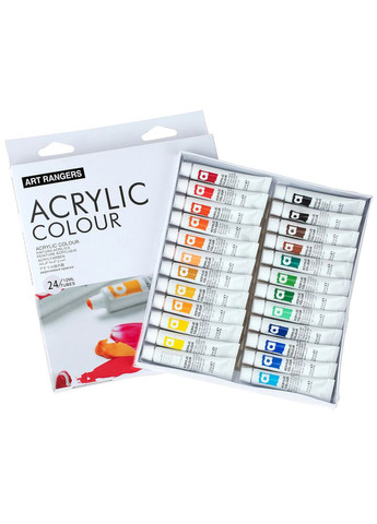 Набір акрилових фарб "Art Ranger" включає 24 туби фарб на водній основі по 22 мл кожна. Фарби насичені, стійкі, мають хорошу покриваність і легко змішуються для створення нових відтінків. Вони підходять для нанесення на різні поверхні, включаючи папір, полотно, дерево, метал, камінь і штукатурку. Фарби упаковані в картонну коробку розміром 13,5 × 10 × 13 см.