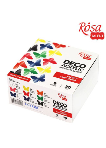 Набір акрилових фарб від ТМ ROSA TALENT - використовуються в вільному розписі для створення кольорових малюнків. Фарби легко наносяться на будь-яку тверду поверхню: кераміку, дерево, папір, картон, ґрунтоване полотно, та ін., добре змішуються, швидко висихають. Після висихання фарби створюють глянцевий ефект. До складу набору входить 9 кольорів по 20мл: Білий, Жовтий, Зелений, Оранжевий, Рожевий, Синій, Фіолетовий, Червоний, Чорний.