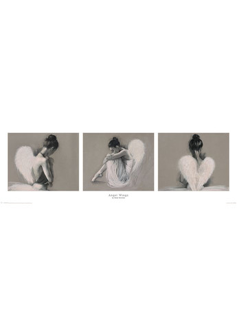 Гейзел Боумен - художник-самоучка з Шотландії спеціалізується на змішаній техніці рисунка, виконуваного вугіллям і пастеллю. Медична освіта дала їй добрі знання людського тіла, що в свою чергу додало експресію її малюнків, більшість з яких присвячені балету. На плакаті представлений триптих художниці під загальною назвою «Angel Wings» (Крила ангела). Тут зображена фігура танцівниці з білими крилами за спиною. Вона відображена в різних позах, але кожна виконана з вишуканістю. Виглядає плакат чарівно, і однозначно привертає увагу. Яскравий постер - це ідеальний спосіб доповнити інтер'єр приміщення, а також створити певну атмосферу і підкреслити індивідуальність, що живуть або працюють в ньому людей. Пропоновані в нашому магазині плакати представляють собою ліцензійну продукцію від англійського виробника. Тобто на їх випуск отримано офіційний дозвіл правовласника. Це важливо як з точки зору законності, так і з точки зору оплати роботи художників, фотографів і дизайнерів, які працювали над створенням постерів. Для їх виготовлення використовується спеціальна високоякісний папір щільністю 150 г/м². Зображення наноситься методом 3-шарової літографічної друку, який дозволяє добитися ідеальної передачі кольору, щільності і насиченості кольору і чіткої, якісної графіки. Крім незаперечних естетичних якостей у плакатів є ще одна важлива перевага - їх дуже просто повісити або, при необхідності, зняти. У нашому інтернет-магазині без проблем можна знайти постер, який органічно впишеться в загальну стилістику інтер'єру і зробить його більш живим.