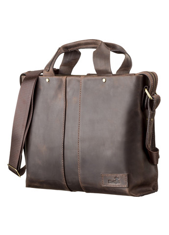 Матеріал: натуральна шкіра; Розміри (ШхВхГ, см): 35х27х7.5; Колір: коричневий; Країна виробник: Україна. Стильна, сучасна чоловіча сумка формату-А4 з двома зручними ручками для повсякденного використання, що дозволяє носити з собою папку з документами, особисті речі. Аксесуар виконаний з натуральної вінтажної шкіри, характерними ознаками якої є: неоднорідність забарвлення та потертості, які надають виробу вишуканого, індивідуального вигляду. Всередині – бічна кишеня на змійці, дві невеликі кишені для телефону, дрібниць та ручок, зміцнене відділення під планшет. Також розташоване велике відділення, яке закривається пряжкою на Магніті. Зовні – на задній стінці - велика кишеня на блискавці. підкладка виготовлена ​​з міцного матеріалу, колір фурнітури: латунь, в наявності плечовий ремінь. Аксесуар упакований у чохол з пилу.