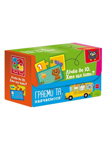 Пазли Асоціації Знайди пару І граємо, і вчимося! Збираємо пазли, запам’ятовуємо цифри, рахуємо до 10. Пазлові картки складаються з двох частин. На одній частині зображена тваринка, на іншій їжа, якою вона харчується. Комплектація: 21 пазл, закладка для книги. Вік: 4-6 років. Відправимо по всій Україні оптом і в роздріб