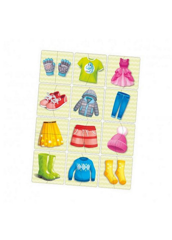Розміри однієї цілої картинки: 7 х 7 см.] У наборі: 12 тематичних картинок-половинок з різним розрізом. Картинки-половинки – це цікава гра, що розвиває, в якій потрібно скласти картинку з двох частин. Гра сприяє розвитку образного та логічного мислення, вчить сприймати зв'язок між частиною та цілим, розвивати дрібну моторику та посидючість. Завдання дитини – з'єднати половинки так, щоб вийшли цілі картинки із зображенням одягу та взуття. 1. Розвиток логічного та понятійного мислення 2. За допомогою такого методичного матеріалу діти пізнають навколишній світ. 3. Розвивається невелика моторика. Вставляючи певним чином детальки, добре тренуються пальчики. 4. Працює зорова пам'ять, тренується увага та посидючість. Упаковка: Без упаковки Вид: Дошкільні Стан: Новий Габарити довжина: 25 Габарити ширина: 9.5 Габарити висота: 4.5 Матеріал: Дерево Тип: Настільна гра Колір: Різні кольори Вікова група: Від 2 років Стать: Унісекс Бренд: Ubumblebees Країна реєстрації Вік: Від 2-х років Країна-виробник товару: Україна Гарантія: 14 днів Країна реєстрації бренду: Україна; Виробник: Ubumblebees; Бренд: Ubumblebees; Країна-виробник товару: Україна; Габарити: ширина: 9.5; Габарити: висота: 4.5; Габарити: довжина: 25; Вага товару: 0; Вид: Дошкільні; Вік: Від 2-х років; Матеріал: Дерево; Тип: Настільна гра; Торгова марка: Ubumblebees; Колір: кольоровий; Розмір виробу: 4,5 х25х9, 5 см; Стать: Унісекс; Упаковка: Без упаковки; Вікова група: Від 2 років;
