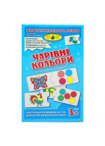 Захоплююча, універсальна настільна гра КФІ Чарівні кольори 85471, орієнтована на пошук співвідношень, буде актуальна як для хлопчиків, так і для дівчаток старше трьох років. Додайте різноманітності щоденним забавам свого непосиди, подаруйте йому цей барвистий набір. Комплект допоможе Вашій непосиді з легкістю, в ігровій формі запам'ятовувати кольору. Таке проведення часу розвиває мову, навички пам'яті, логічне і асоціативне мислення, дрібну моторику рук. У наборі містяться ігрові картки - пазли, необхідні для захоплюючого проведення часу. Ігровий комплект розроблений із застосуванням безпечного, екологічно чистої сировини і барвників, які не мають запахів і не викликають неприємних реакцій. Цікава настільна гра, яка розвиває кмітливість і швидкість реакції, підходить як для домашнього проведення часу, так і для дитячого саду.