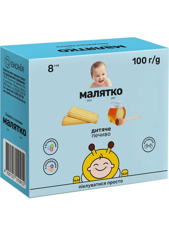 Дитяче печиво Малятко Медове має ніжний смак і аромат, тому воно безсумнівно стане улюбленими ласощами вашої дитини. Основні переваги: виготовлено за спеціально розробленою рецептурою для малюків 2-го півріччя життя, з урахуванням їх вікових потреб у поживних речовинах та особливостей травної системи збагачено вітамінами (А, Е, Д, С та групи В) та мінералами (залізо, йод, цинк, калій, кальцій та фосфор) без шкідливих жирів, консервантів, підсилювачів смаку та барвників швидко розчиняється у воді, молоці та соку, перетворюючись на кремоподібну кашку, тому його можна давати з ложечки продукт також сподобається і дітям дошкільного віку, вагітним і мамам, що годують Важливо: перед початком вживання слід проконсультуватися з педіатром Умови зберігання: зберігати при температурі 20±5°С та відносній вологості повітря не більше 75%. Почату упаковку зберігайте не більше двох тижнів у сухому прохолодному місці, але не в холодильнику, щільно закривайте після кожного використання. Спосіб застосування: можна використовувати в сухому вигляді, або після попереднього розчинення в теплому молоці, суміші, соку. Приготування: продукт готовий до вживання. Характеристики Виробник: Еконія, Україна. Рекомендовано для дітей від 8 місяців.