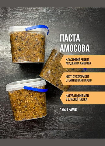 Паста Амосова – це вітамінна суміш, яка здобула популярність завдяки своїй натуральності та користі для організму. Класичний рецепт академіка Амосова цієї медової суміші зібрано з простих та надзвичайно поживних інгредієнтів, що допомагають підтримувати здоров'я, зміцнювати імунітет і заряджати енергією. Вітамінна паста Амосова визнана медиками джерелом вітамінів, антиоксидантів і мікроелементів, яких потребує серце і організм в цілому. Вперше застосовувати її Микола Амосов почав після того, як зауважив: пацієнти, які після операції частіше вживали в їжу горіхи і сухофрукти, швидше відновлювали сили, здоров'я та поверталися до поноцінного життя. Паста Амосова – це справжній дар природи, бо забезпечує ваш організм необхідними поживними речовинами, що допомагають боротися зі стресом, підвищують імунітет і підтримують загальне здоров’я. Для приготування класичної медової пасти Амосова ми використовуємо відбірні сухофрукти стерілізовані парою та екологічно чистий мед. Мед різнотравʼя з власної пасіки - натуральний мед зміцнює захисні сили організму, допомагає боротися з інфекціями та зменшує запалення, допоможе зменшити рівень стресу та тривожності завдяки своїм заспокійливим властивостям. Чернослив сушений - допомагає знижувати рівень "поганого" холестерину, підтримує здоров’я серцево-судинної системи, сприяє нормалізації обміну речовин, покращує роботу печінки. Курага - є одним з найкращих природних джерел калію, допомагає підтримувати нормальний рівень водно-сольового балансу в організмі, регулює кров’яний тиск і сприяє нормалізації роботи серця. Курага багата на залізо, що допомагає в боротьбі з анемією та сприяє утворенню здорових червоних кров'яних клітин. Ізюм в'ялений в тіні - завдяки високому вмісту калію, саме такі родзинки допомагають нормалізувати кров’яний тиск і підтримують серцево-судинну систему. Інжир - містить кальцій, магній, калій, що зміцнюють кістки, підтримують нормальне функціонування нервової системи та серця. Саме цей продукт допомагає зменшити рівень стресу та тривожності. Волоський горіх - мають високу концентрацію антиоксидантів та вітамінів групи B, що підтримують здоров’я мозку, покращують пам'ять і концентрацію. Цитрусові - одне з найкращих джерел вітаміну C, який підвищує захисні сили організму та допомагає боротися з вірусами та інфекціями. Кожна ложка такої вітамінної медової суміші є витонченим джерелом важливих поживних речовин для вашого здоров'я. ✔️ Підтримка серцево-судинної системи - волоські горіхи багаті на ненасичені жирні кислоти, які знижують рівень холестерину, а калій у сухофруктах допомагає регулювати артеріальний тиск. Цитрусові підтримують еластичність судин, сприяючи покращенню кровообігу. ✔️ Зміцнення імунітету - лимон потужне джерело вітаміну С, який активізує захисні сили організму. Мед, відомий своїми антибактеріальними властивостями, допомагає боротися з інфекціями. ✔️ Покращення травлення - чорнослив і курага містять багато клітковини, що сприяє роботі кишківника, полегшує травлення та допомагає боротися з закрепами. ✔️ Зниження стресу - магній, що міститься у сухофруктах і горіхах, допомагає розслабити нервову систему, знижує рівень стресу та покращує сон. ✔️ Енергетична підтримка - це натуральне джерело швидких вуглеводів, які забезп