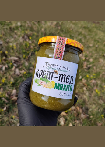 «Крем-мед МОХІТО» Описуючи смак «Крем-меду МОХІТО», в одне речення можна вставити відразу декілька, на перший погляд не сумісних за значенням слів, та саме ними можна найкраще описати смак цього десерту. Не стандартний, дивний, незвичний, дикий, ароматний, м’ятний, кисло-солодкий, гіркувато-пекучий, теплий, різнобарвний… і так можна продовжувати дуже довго. Незвичайний – бо має дивний злегка дикий та нестандартний колір, не надто темний проте гарно виражений, досить соковитий на вигляд темно-оливковий з домішкою гірчичного кольору та легким відтінком жовтувато-коричнюватої хвої. Дуже незвично виглядає, як на яскравому сонячному світлі так і в затемненому приміщенні змінюючи свою кольорову гаму від яскравого до тусклого відтінків жовтуватої зелені. До незвичного також можна віднести і смак цього крем-меду, адже в одній баночці поєдналися декілька відтінки смаку: м’ятний, медовий, кисло-солодкий та гіркувато-пекучий! При куштуванні першою у гру вступає м’ята, її смак не надто виражений в десерті на відміну від аромату, саме запах м’яти відчувається відразу при відкритті кришечки, а при додаванні цього крем-меду до звичайної гарячої кип’яченої води, складається враження ніби смакуєш справжній зелений чай з лимоном, при цьому не обов’язково навіть додавати пелюстки самого чаю. Другою у гру вступає більш яскраво виражена кислинка лимону та лайму – які завдяки меду смакують більш ніжно і не викликають оскоми в роті, як зазвичай це робить, до прикладу, всім відомий свіжий лимон. І вже третім на арені з’являється імбир, своїм смаком він майже повністю витісняє наявну, легку гірчинку від цедри сублімованого лайму, виникає відчуття ніби в роті стає гаряче, а потім тепло переходить в легке ніби поколювання та печіння, і на при кінці з’являється виражений смак імбиру, який досить довго тримається на язиці. Єдиним незначним недоліком в крем-меді Мохіто є дрібнесенькі шматочки волокон м’ята та імбиру, проте загальної картини вони не псують та не впливають на сам смак, просто відчуваються на язиці при безпосередньому куштуванні з банки. Незвичний, одночасно щільний та ніби пористий смак, відмінний від усіх наявних крем-медів, а також приємний аромат м’яти, лимону, лайму та імбиру у поєднанні з ніжним смаком та ароматом меду обов’язково здивують ваші смакові рецептори. Кожне нове поєднання чотирьох субліматів та меду, різного вмісту квіткового нектару, утворює новий «шедевр», адже мед в свою чергу теж впливає на густину та смак продукту як і сублімовані інгредієнти, які додані до нього. Спробуйте таке поєднання з чорним чи зеленим чаєм, чи додайте його до звичайної води, чи навіть до каші заміст цукру, намажте на грінки чи печиво, або ж додайте до більш міцного напою зробивши коктейль, чи взагалі смакуйте просто з банки ложкою, варіантів безліч, достатньо лише скористатися своєю фантазією. Такий неймовірний смак, колір та аромат нашого крем-меду створюється завдяки використанню лише натуральних та природніх компонентів, БЕЗ додавання будь-яких консервантів, барвників, цукру, глютену чи ГМО. «Крем-мед МОХІТО» складається лише з двох натуральних продуктів: меду різнотрав’я – 93 % на 100 грам готового продукту (збитого за відповідною технологією до консистенції ніжного, повітряного, пастоподібного крему, який більше ніколи не кристал