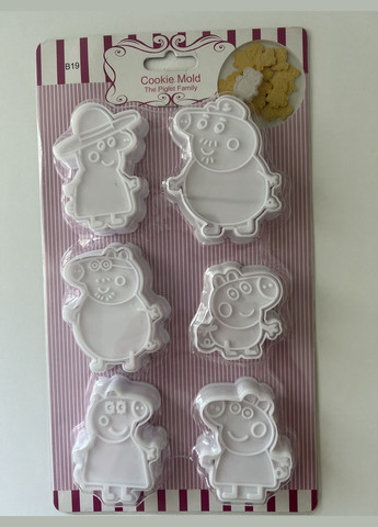Форми для печива та медових пряників у вигляді героїв мультсеріалу Свинка Пепа. Виготовлені з харчового пластику. Тип: контур+штамп. Рекомендації: зберігати в сухому місці, по далі від сонячних променів Мити в холодній воді, не мити в посудомийній машині, не ставити в духовку, не сушити на батареї чи феном Не піддавати будь якого роду нагріванню В набір входять 6 формочок.