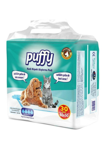 Одноразові гігієнічні пелюшки Puffy Cat&Dog підходять для собак, цуценят, котів та інших домашніх тварин. Завдяки великому розміру 60x90 см, вони зручні у використанні навіть для тварин середніх і великих порід. Упаковка містить 30 штук. Суперпоглинаючий полімер швидко вбирає вологу та надійно утримує її всередині, запобігаючи протіканню та поширенню неприємного запаху. Поверхня залишається сухою, що забезпечує комфорт і гігієну для вашого улюбленця. Переваги: Надійне поглинання і захист від запаху Великий розмір — 60x90 см Гігієнічні, одноразові, зручні у використанні Універсальне застосування — для собак, котів та інших тварин Упаковка — 30 штук