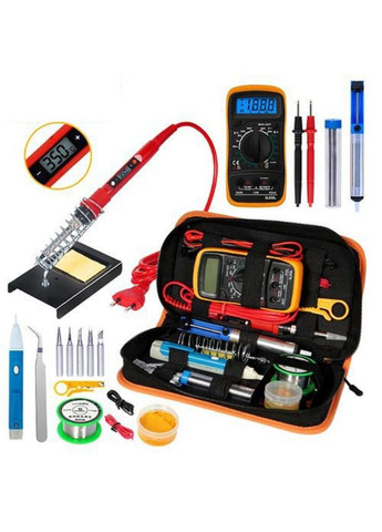 Набір інструментів для паяння з терморегулятором 60W 16 в 1. Паяльник 60 Вт до 450 C° Паяльник оснащений електронним термодатчиком, який вимірює температуру жала, вслід мікроконтролер дає імпульсну напругу для регулювання, тим самим, дозволяючи однаково якісно припаяти як мікро деталь, не перегрів її, так і велику металеву деталь, наприклад, електролітичний конденсатор. У звичайних дешевих паяльниках з регулятором температури, регулювання досягається зниженням напруги живлення до потрібного рівня. Сумка чохол має прямокутну форму та виконаний із міцної тканини. Для кожного елемента в сумці відведено окреме місце, що дозволяє всім інструментам розташовуватися окремо один від одного. Розташування окремо всіх додаткових елементів дозволяє не тільки утримувати все гаразд, а й уникнути плутанини в їхньому розташуванні. Даний набір буде зручний як початківцям та любителям дрібного паяння, так і професіоналам, які щільно займаються ремонтом дрібної побутової електроніки. Особливості - Зручний, переносний набір для паяння різної дрібної електроніки. - Наявність усіх необхідних допоміжних інструментів для полегшення роботи. - Наявність термодатчика в паяльнику для якіснішого паяння. - Паяльник із комплекту має регулятор температури від 180 °C до 480 °C. - У паяльнику використовується керамічне паяльне нагрівальне жало. - Зручна упаковка для перенесення та зберігання всіх інструментів. Характеристики - Потужність: 60 Вт. - Частота: 50-60 Гц. - Діапазон температури: 180-450 °С. - Стабільність температури: ±5°С. - Тип нагріву: керамічний елемент. - Жало паяльника: 900M – B1.2. - Довжина дроту: 1,4 метри з вимикачем. - Розмір паяльника: 242 х 25 х 25 мм. - Вага паяльника: 96 грам. - Матеріал упакування: щільна тканина. - Розмір упаковки: 265 х 155 х 50 мм. - вага упаковки: близько 700 грам. Комплектація 1 шт - паяльник 1 шт - припой с оловом 5 шт - наконечники для паяльника 1 шт - підставка для паяльника 1 шт - мультиметр з щупами 1 шт - міні-інструмент для зачистки проводів 1 шт - пінцет вигнутий ESD-15 2 шт - чорний провід 22 та червоний провід 22 AWG 1 шт - трубка для паяння 1 шт - олововідсмоктувач для паяння 1 шт - сумка для перенесення 1 шт - губка для чищення