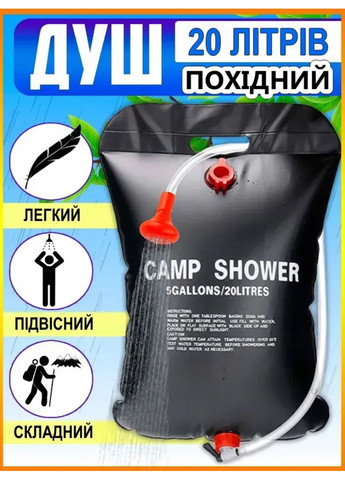 Душ для кемпінгу Camp Shower 40 л – це незамінний мобільний пристрій для прийняття душу будь-де: в саду, в лісі, на пікніку або на городі. Вам потрібно лише знайти дерево або стійку для підвішування. Душ для кемпінгу Camp Shower – практичний портативний переносной душ Цей портативний душ – ідеальний варіант для кемпінгу та відпочинку на свіжому повітрі. Він складається з щільного мішка, що герметично закривається, виготовленого з міцного полівінілхлориду (ПВХ) товщиною 0,36 мм. Резервуар для води має об’єм 40 літрів, що забезпечує достатню кількість води для повноцінного душу. Особливості: Простота використання: Душ легко підвісити на гачок, стовп або гілку дерева. Ефективне нагрівання: Чорний колір мішка дозволяє воді швидко нагріватися на сонці, забезпечуючи теплу, комфортну температуру. Компактність: Легкий і зручний у транспортуванні, він не займає багато місця в багажі. Camp Shower 40л – це простий і зручний пристрій, який стане вашим надійним супутником під час подорожей, на дачі або на природі. Насолоджуйтесь комфортом теплого літнього душу в будь-яких умовах! Технічні характеристики: Розмір упаковки Camp Shower, душ для дачної ділянки або походу: 15,5х5х31см Розмір ємності для води у дачного душу: 40х60см Вага – 0,5 кг Колір – насичений чорний, для кращого нагріву від сонячних променів