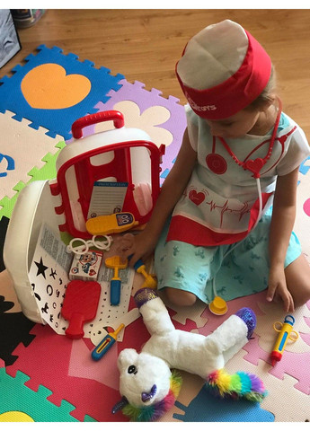 Дитина боїться медиків? «Doctor's kit» допоможе подолати страхи, і подарує море позитивних емоцій під час гри «в лікарню». Іграшкова медична валіза укомплектована всім необхідним для того, щоб дитина відчула себе справжнім лікарем. У наборі є: стетоскоп, молоточок, градусник, шприц, ножиці, грілка, пінцет, листок для виписування рецептів, іграшкова упаковка таблеток, «лікарські» окуляри і навіть спеціальна таблиця для перевірки зору. Така таблиця - справжня новинка, в інших медичних наборах Ви її не знайдете. Ще одна особливість іграшки полягає в тому, що кришка валізи прикрашена дизайнерським зображенням, нанесенням за технологією IML (безпосередньо інжекція малюнка на іграшку). Такий малюнок не втрачає яскравості і, на відміну від наклейки, є довговічним. Всі іграшки в наборі виготовлені з якісних і безпечних матеріалів, не мають запаху.
