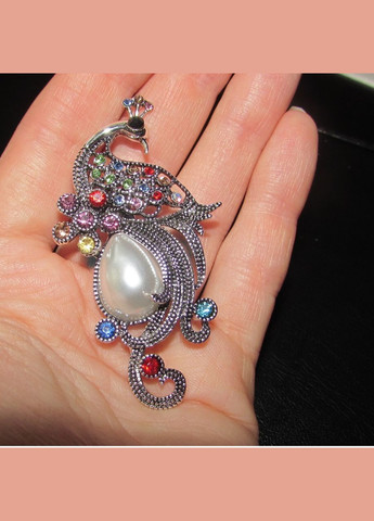 Брошка під крапельне срібло Жар-птиця - красива прикраса для вас! Розмір: 6,2х3,5 см, застібка - 2,2 см Склад: ювелірний сплав, сріблясте напилення, стрази, перламутрова вставка