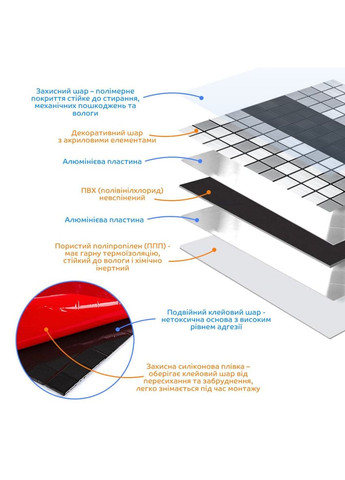 Опис: Розміри: 30х30 товщина 3 мм Вага: 1 плитка 200 грам Фактура: досить гладка, але є візуальний ефект 3D, не глянець, є невеликий перламутровий блиск Застосування: Підходить для внутрішніх оздоблювальних робіт в умовах підвищеної температури та вологості, декорування стін у всіх видах житлових та комерційних приміщень, а також для декорування та відновлення меблів, дверей та інших рівних поверхонь. Крім того, властивості алюмінію дозволяють використовувати цей матеріал для зовнішніх робіт. Матеріал: Захистний шар: полімерне покриття стійке до стирання, механічних пошкоджень та вологи, завдяки йому плитка довго зберігає свій естетичний вигляд. Полімерний шар може бути прозорим або кольоровим, має матову поверхню. Алюмінієва пластина: Алюміній має особливу кристалічну структуру – ГЦК (гранецентровані кубічні) грати... ПВХ (полівінілхлориду) у неспіненій формі: На відміну від спіненого ПВХ, цей матеріал не містить мікроскопічні повітряні площини, тому його щільність вища, відповідно він твердіший, стійкіший до механічних впливів і більш термостійкий . Пористий поліпропілен (ППП): Це термопластичний полімер, його структура включає повторювані молекулярні одиниці пропілену... Подвійний клейовий шар: нетоксична основа з високим рівнем адгезії. Захисний силіконізований папір: оберігає клейовий шар від пересихання та забруднення, легко знімається під час монтажу. Основні переваги алюмінієвих плиток: Міцність та довговічність: Завдяки алюмінієвому покриттю плитка має високу міцність, захищаючи її від пошкоджень та зносу... Стійкість до вологи: ПВХ матеріал має високу стійкість до вологи, тому така плитка можна використовувати у вологих умовах, таких як ванна кімната або кухня. Алюмінієве покриття додатково захищає... Стійкість до високих температур: Температурний режим алюмінію в діапазоні від -270°C до близько 660°C... Легка установка: Плитка, що самоклеїться, має спеціальний клей на звороті, що дозволяє легко встановлювати її без необхідності використання додаткового клею або інструментів... Декоративні можливості: алюмінієва плитка доступна в різних кольорах та дизайнах. Це дозволяє вибрати плитку, яка найкраще підійде до інтер'єру вашого приміщення. Якісна альтернатива кахлю та керамічній плитці. Легкість догляду: ПВХ матеріал легко чиститься і не вимагає особливого догляду. Ви можете використовувати звичайні миючі засоби та ганчірку для очищення поверхні... Монтаж: Вимога до поверхонь Алюмінієву плитку на самоклеючій основі можна укладати на більшість структурно міцних основ, якщо вони чисті, плоскі, гладкі, сухі, не містять пилу, воску, мильної піни та жиру... Зверніть увагу, що шорсткі поверхні, такі як цегляна, кам'яна, фанерна або масляна стіна, не підходять для встановлення. Необхідно переконатися, що поверхня, на яку ви збираєтеся встановити плитку, відповідають вищезазначеним вимогам. Плитка та поверхня повинні бути кімнатної температури, щоб забезпечити гарне зчеплення клейової основи. Зняти захисну плівку зі зворотного боку плитки, щоб відкрити клейку поверхню. Необхідно розпочати встановлення з одного кута і акуратно притиснути плитку до поверхні, стежачи за тим, щоб плитка встановлювалася рівно і акуратно, уникаючи утворення бульбашок або зморшок. Плитку можна різати, використовуючи при цьому будівельний ніж або 