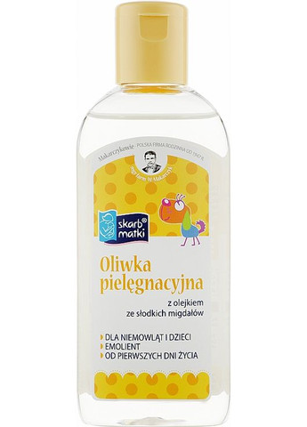 Олія для догляду за шкірою малюків — стратегічно важливий засіб — це знає кожна турботлива мама. Якщо ви в пошуках якісного б'юті-продукту, придивіться до асортименту бренда Skarb Matki: одну з перших позицій займає ніжна мигдальна олія, яку можна застосовувати з перших днів народження. Ароматний продукт усуне подразнення і сухість ніжної шкіри, його можна застосовувати після купання як живильний і зволожувальний засіб, а також використовувати щоразу під час зміни підгузків, щоб запобігти попрілості й почервонінню. Особливості мигдалевої олії для дітей Skarb Matki: - рекомендується для щоденного догляду за ніжною і чутливою дитячою шкірою;- можна застосовувати для купання;- чудово живить;- забезпечує глибоку зволожувальну дію;- очищає шкіру дитини щоразу під час зміни підгузків;- не забруднює нижню білизну;- добре всотується;- густа консистенція;- забезпечує тривалий захист шкіри;- комфортне застосування;- приємний аромат;- захищає шкіру дитини від сухості й несприятливих зовнішніх факторів;- склад збагачений екстрактом ромашки;- для немовлят із перших днів життя і дітей.