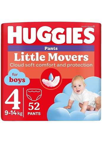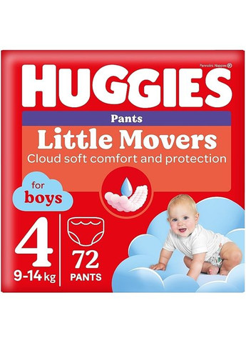 Якщо у вас підростає хлопчик, знайте: кращого захисту від протікань, ніж Huggies Pants, вам не знайти. Вони створені спеціально для хлопчиків з урахуванням їхніх фізіологічних особливостей. Трусики-підгузки в розмірі 4 підходять для малюків вагою 9-14 кг. Вони ефективно, швидко і якісно поглинають вологу, утримуючи її всередині протягом тривалого часу. Підгузки не протікають і не провисають, даючи змогу дитині відчувати себе на 100 % комфортно. Особливості Huggies Pants для хлопчиків:- виготовлені з м'якого і повітропроникного матеріалу, який дбайливо захищає шкіру;- забезпечують до 12 годин сухості шкіри;- з новим шаром м’яких повітряних подушечок, які поглинають за секунди;- спеціальне розташування поглинаючих каналів спереду для максимального захисту хлопчиків;- подвійні бортики, що запобігають протіканню;- анатомічна форма між ніжками для можливості активно рухатися;- індикатор вологи змінює колір, повідомляючи про наповненість;- м'який поясок, який ніжно обіймає животик, але не стискає його, забезпечуючи комфорт;- бічні частини легко розриваються для швидкого зняття підгузка;- фіксуються клейкою стрічкою в скрученому вигляді для утилізації – зніміть, поверніть, закріпіть липучкою;- яскравий дизайн Disney із зображенням Мікі Мауса - по 2 дизайни у кожному розмірі;- дерматологічно протестовані, не містять віддушок, елементарного хлору чи натурального латексу.