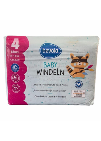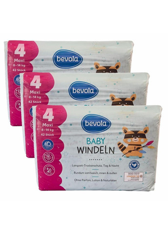 Підгузники Bevola- це захист від протікань навіть при інтенсивних рухів дитини.- зберігають в сухому стані шкіру дитини до 12 годин;- дозволяють шкірі дихати;- здорова дитяча шкіра завдяки потрійним абсорбуючим каналам, які добре вбирають і розприділяють вологу, залишаючи її сухою надовго;- внутрішня тканина м'яка, як бавовна;- супер ефект поглинання;- дерматологічні перевірені;- покликані знизити ризик виникнення алергічної реакції;- повномірні;- барвистий дизайн.