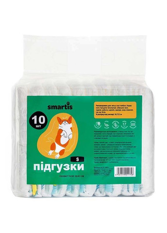 Підгузки Smartis для собак захищають ваш будинок та меблі від виділень, підтримують гігієну вихованки. Виріб з м'якими застібками, які добре тягнуться, міцно тримаються навіть після кількох застібок. Для своєчасної зміни підгузки є індикатор наповнення. Виріб виготовлений з гіпоалергенних матеріалів, повністю безпечних для здоров'я та життя тварини. Особливості та переваги: у упаковці - 10 підгузників; Характеристики: Розміри: L (53х26 см) – для собак великих розмірів. Обхват талії: 39-55 см. Підходять представникам порід: лабрадор, американський стаффордширський тер'єр, аляскинський маламут, різеншнауцер, ротвейлер. M (42,5 х23 см). Обхват талії: 37-53 см. Підходять представникам порід: німецька вівчарка, американський стаффордширський тер'єр, кане-корсо, доберман, акіта-іну. S (36,5 х22 см). Обхват талії: 35-51 см. Підходять представникам порід: вельш корги пемброк, бордер коллі, бульдог, бультер'єр, сибірський хаски, бігль, пудель, шиба-іну, шарпей, самоїд, кокер-спаніель, чау-чау. XS (34х22 см). Обхват талії: 34-50 см. Підходять: щенятам та декоративним собакам. XХS (28х22 см). Обхват талії: 32-48 см. Підходять: щенятам та декоративним собакам. Увага! Для правильної посадки підгузник при виборі розміру слід звертати увагу на параметр «розмір у розгорнутому вигляді», а саме довжину виробу! Фасування: L (53х26 см); М (42,5 х23 см); S (36,5 х22 см); XS (34х22 см); XХS (28х22 см)