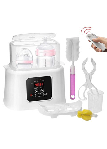 Універсальний та багатофункціональний пристрій з двома пляшечками та пультом дистанційного керування DUO Smart Baby – підігріває та стерилізує дитячі пляшечки та аксесуари. Функціонал: Розігрів молока та дитячого харчування; Стерилізація пляшечок за допомогою пари; Підтримка необхідної температури протягом певного часу; Розморожування вмісту пляшечки. Переваги: Завдяки плавному розігріву в підігрівачі, зберігаються вітаміни та поживні речовини у сумішах та молоці. Автоматична підтримка температури в підігрівачі не дасть харчуванню охолонути. Підігрівач сумісний із пляшечками інших виробників. Виготовлений із якісного, безпечного матеріалу. Функції: Підігрів молока [Warm milk] – дана функція призначена для підтримки температури молока. Додайте 400 мл води до пристрою. Поставте пляшечку (не ставте підставку на дно пристрою, вона використовується для стерилізації). Увімкніть пристрій. Увімкніть кнопку Warm milk (стандартна температура підігріву близько 40 градусів С, але ви можете виставити температуру вручну в діапазоні від 38 до 60 градусів C). Після початку роботи пристрою, під час нагрівання до заданої температури, на екрані зліва "target temp" буде вказана температура до якої буде зроблено нагрівання. Праворуч "current temp" – відображатиметься поточна температура. Завершення нагріву відбудеться, коли "current temp" буде таким, як "target temp". Регулювання температури виставляється під час миготіння індикатора функції. Коли індикатор функції перемикається з миготіння на миготіння, це означає, що робота пристрою вже розпочата. Особлива формула [Formula] – функція приготування сухого молока. Додайте 400 мл води до пристрою. Поставте пляшечку (не ставте підставку на дно пристрою, вона використовується для стерилізації). Увімкніть пристрій. Натисніть кнопку "Function" і виберіть "Formula" (стандартна температура підігріву близько 45 градусів С, але ви можете виставити температуру вручну в діапазоні від 38 до 60 градусів C). Про операції регулювання температури та запобіжні заходи перегляньте інструкцію функції підігріву молока. Підігрів їжі [Heating Food] – функція для підігріву їжі. Додайте 400 мл води до пристрою. Поставте пляшечку (не ставте підставку на дно пристрою, вона використовується для стерилізації). Увімкніть пристрій. Натисніть кнопку "Function" та виберіть функцію "Food" (стандартна температура підігріву близько 70 градусів С, але ви можете виставити температуру вручну в діапазоні від 65 до 80 градусів C). Про регулювання температури та запобіжні заходи перегляньте інструкцію функції підігріву молока. Sterilize – функція стерилізації. Для економії часу місце у стерилізаторі розраховане на дві пляшечки. Додати 150-200 мл води. Увімкніть пристрій. Натисніть кнопку "Function" та виберіть функцію "Sterilize" (стандартний час стерилізації становить близько 12 хв, але може бути виставлено вручну від 6 до 30 хв за допомогою стрілок, що відображають частку від години, наприклад 0.2 = 12 хв, 0.5 = 30 хв Покладіть підставку для пляшок на дно пристрою. Для стерилізації пляшки покладіть у відкритому вигляді верхню частину донизу. Defrost – розморожування молока. Додати 400 мл води. Увімкніть пристрій. Натисніть кнопку "Function" і виберіть функцію "Defrost" (стандартна температура розморожування становить близько 35 градусів, але може бути виставлена вручну від 30 до 40 градусів C). Timer – функція таймера на увімкнення. Натисніть