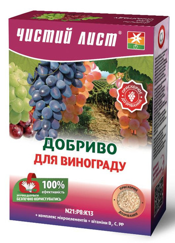 Чистий лист — високоефективне комплексне добриво для винограду. Застосовується для підживлення виноградної лози впродовж усього сезону. Може бути використаний для поливання, обприскування та сухого внесення в ґрунт. Повністю розчиняється у воді та чудово поєднується з органічними добривами та пестицидами. Добриво являє собою збалансований комплекс макро- та мікроелементів + вітаміни + фітогормони. До складу входять: азот, фосфор, калій, магній, залізо, цинк, молібден, мідь, марганець, кобальт, вітаміни (тіамін, аскорбінова кислота, нікотинова кислота). Завдяки наявності заліза та магнію, не пригнічуються процеси утворення хлорофілу. Ефективність препарату підвищується у разі регулярного поливання. Переваги добрива Чистий лист для винограду: просте в застосуванні, покращує склад ґрунту, швидко проникає в рослину та ліквідує дефіцит поживних речовин, забезпечує рослини повноцінним харчуванням, сприяє збереженню виноградної лози в зимовий період, підвищує захисні функції рослин до хвороб і несприятливих умов, стимулює утворення більшої кількості зав'язок. У зимуючих окулярах і нирках формується більше суцвіть, збільшує розміри виноградного пензля та ягід, покращує смакові якості ягід (підвищує вміст у них цукрів і вітамінів), забезпечує високу врожайність. Способи застосування й приготування робочого розчину: осіннє сухе внесення в ґрунт — 15 мірних ложок (90 грамів) змішати з 2-3 літрами сухого піску або ґрунту. Вносити в лунки навколо куща, на глибину 25-40 см, або під кущ із подальшою глибокою закладенням (перекопкою), навесні, на початку вегетації — 15 мірних ложок (90 грамів) розчинити в 5-9 літрах води. Поливати під кущ. На важких ґрунтах — у лунки завглибшки 25-40 см, кореневе підживлення — 1-2 мірні ложки розчинити в 5-9 літрах води. Поливати під кущ, позакореневе підживлення — 0,5-1 мірну ложку розчинити в 9 літрах води. Обприскувати 3-4 рази на місяць. Мірна ложка в комплекті