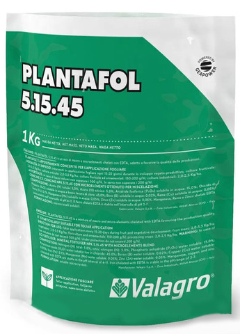 Мінеральне добриво з мікроелементами у формі хелатів. Збалансоване співвідношення NPK ефективне для підживлення різних видів рослин. Особливо ефективний на фазі дозрівання, високий вміст калію допомагає покращити структуру клітин, зміцнює лист. Спосіб внесення: Листове підживлення. Високоефективне добриво Plantafol 5-15-45 вноситься некореневим способом (через пульверизатор або оприскувач) з розрахунку: 250 г на 100 літрів води на сотку – овочеві, ягідні, плодові культури у відкритому ґрунті та теплиці. Обприскування варто здійснювати з інтервалом 7-10 днів: • Помідори, огірки, перець – на фазі дозрівання плодів; • Картопля – в період змикання бадилля в грядках; • Капуста – під час дозрівання плодів; • Виноград – в період дозрівання та за 15 днів до збору врожаю, всього 2 обробки; • Яблуня – в період набору маси плодів, 2 рази. Ефективність добрива Плантафол 5-15-45 значно покращується у комплексі з інсектицидами, пестицидами, препаратами Мегафол, Брексіл та Максікроп. Також допустиме приготування суміші з кальцієвою селітрою.