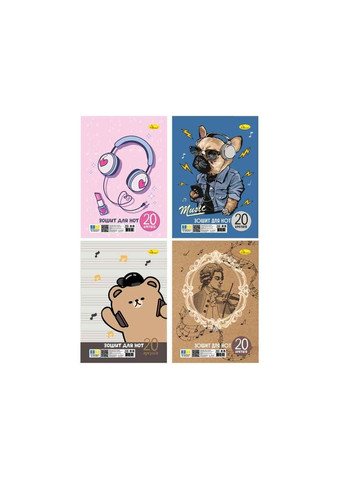 ХарактеристикиФормат/розмір: А4 Кількість аркушів: 20 Кількість дизайнів обкладинки: 4; МІКС дизайнів в упаковці. Обкладинка та скріплення: крейдований картон, УФ-лак; скріплення пружиною. Блок: офсетний папір; нотний стан. Зручність такого зошита полягає в тому, що скріплення пружиною дозволяє гарно розкласти зошит та поставити на підставку музичного інструменту. Зошит для нот, скріплений пружиною, не перевертається на підставці та є дуже зручним помічником для занять з музики. Оригінальні, нестандартні та сучасні дизайни зошитів для нот зацікавлять дітей. Зошити для нот допоможуть учителеві організувати діяльність учнів на уроках, сприятимуть позитивному налаштуванню на уроки музичного мистецтва, сприятимуть ефективному засвоєнню програмового матеріалу з музики. Зошити для музичних шкіл можуть бути використані як початківцями, так и досвідченими музикантами. Зошити для нот – незамінний інструмент для розвитку музикальних навичок дитини.