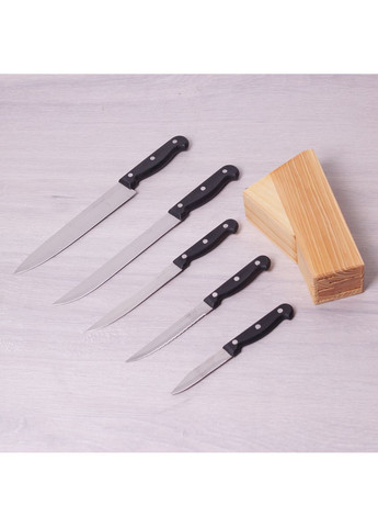 Набір ножів завжди знадобиться на кухні. Всього в комплекті сім кухонних аксесуарів: ніж для овочів, універсальний, кухарський, для хліба та ніж для нарізки, ножиці, мусат. Ножі відрізняються розмірами та призначенням, при цьому виконані в ідентичному оформленні. Виготовлений набір із міцної та екологічно чистої нержавіючої сталі. Ергономічні ручки зручно тримаються в руці та не ковзають під час роботи з ними. Леза гострі, легко підточуються за потреби. Також вироби легко відмиваються після використання, на це не йди багато часу. У наборі є підставка для ножів та інших аксесуарів, що йдуть у комплекті.