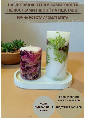 Набір свічок "Аромат Природи" Вишуканий набір авторських свічок ручної роботи — справжня ода природній красі! Набір складається з двох свічок: Циліндр 14×6,5 см із гілочками хвої, що символізує свіжість лісу, Циліндр 9×6,5 см з ніжними пелюстками півонії, що уособлюють романтику й ніжність. Свічки виготовлені з якісного парафіну, з бавовняним гнотом, наповнені натуральними ароматами або доступні без аромату для створення затишку без зайвих ноток. Розташовані на стильній овальній гіпсовій підставці з бортиками, вони стануть витонченим акцентом у будь-якому інтер'єрі. Ідеальний подарунок для тих, хто цінує природність, естетику та тепло ручної роботи! Особливості: Склад: парафін, ароматизатор, натуральні сухоцвіти. Час горіння однієї свічки: Близько 50 годин. Розмір: Діаметр 6,5 см, висота 14 см. Аромат: М'ята Також Ви можете вибрати, як доповнення подарункову упаковку (біла коробка+атласна стрічка) Кожна ботанічна свічка з натуральними сухоцвітами - неповторні та ексклюзивні!!! 100% повтор свічки, як у фото неможливий, т.к. кожен сухоцвіт унікальний від природи. Власне виробництво, всі наші товари виготовлені у ручну Відтінок кольору може трохи відрізнятися від фотографій, залежно від налаштувань екрана, а також умов освітлення під час зйомки.