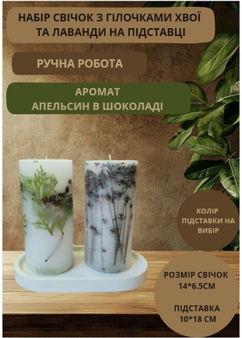 Набір свічок "Аромат Природи" Вишуканий набір авторських свічок ручної роботи — справжня ода природній красі! Набір складається з двох свічок: Циліндр 14×6,5 см із гілочками хвої, що символізує свіжість лісу, Циліндр 9×6,5 см з ніжними пелюстками півонії, що уособлюють романтику й ніжність. Свічки виготовлені з якісного парафіну, з бавовняним гнотом, наповнені натуральними ароматами або доступні без аромату для створення затишку без зайвих ноток. Розташовані на стильній овальній гіпсовій підставці з бортиками, вони стануть витонченим акцентом у будь-якому інтер'єрі. Ідеальний подарунок для тих, хто цінує природність, естетику та тепло ручної роботи! Особливості: Склад: парафін, ароматизатор, натуральні сухоцвіти. Час горіння однієї свічки: Близько 50 годин. Розмір: Діаметр 6,5 см, висота 14 см. Аромат: Апельсин в шоколаді Також Ви можете вибрати, як доповнення подарункову упаковку (біла коробка+атласна стрічка) Кожна ботанічна свічка з натуральними сухоцвітами - неповторні та ексклюзивні!!! 100% повтор свічки, як у фото неможливий, т.к. кожен сухоцвіт унікальний від природи. Власне виробництво, всі наші товари виготовлені у ручну Відтінок кольору може трохи відрізнятися від фотографій, залежно від налаштувань екрана, а також умов освітлення під час зйомки.