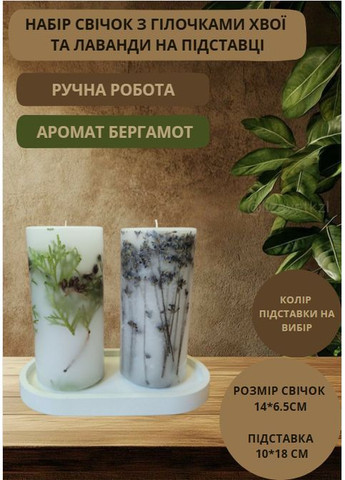 "Лавандовий спокій і Хвойна свіжість" - набір свічок на гіпсовій підставці Стильний набір свічок ручної роботи — ідеальне поєднання природи та естетики. До складу входять дві парафінові свічки: одна з натуральною лавандою, інша з хвоєю, що символізує гармонію й оновлення. Встановлені на елегантній овальній гіпсовій підставці з бортиками. Свічки доступні у варіантах із ніжними ароматами або без запаху. Прекрасний варіант для затишку вдома, подарунка або стильного декору. 🕯 Розмір свічок: 14×6,5 см 🕯 Матеріал: парафін 🕯 Аромати: різні аромати на вибір або без аромату 🕯 Основа: міцна гіпсова підставка ручної роботи Особливості: Склад: парафін, ароматизатор, натуральні сухоцвіти. Час горіння однієї свічки: Близько 50 годин. Розмір: Діаметр 6,5 см, висота 14 см. Аромат: Бергамот Також Ви можете вибрати, як доповнення подарункову упаковку (біла коробка+атласна стрічка) Кожна ботанічна свічка з натуральними сухоцвітами - неповторні та ексклюзивні!!! 100% повтор свічки, як у фото неможливий, т.к. кожен сухоцвіт унікальний від природи. Власне виробництво, всі наші товари виготовлені у ручну Відтінок кольору може трохи відрізнятися від фотографій, залежно від налаштувань екрана, а також умов освітлення під час зйомки.