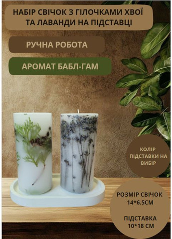 Набір свічок "Аромат Природи" Вишуканий набір авторських свічок ручної роботи — справжня ода природній красі! Набір складається з двох свічок: Циліндр 14×6,5 см із гілочками хвої, що символізує свіжість лісу, Циліндр 9×6,5 см з ніжними пелюстками півонії, що уособлюють романтику й ніжність. Свічки виготовлені з якісного парафіну, з бавовняним гнотом, наповнені натуральними ароматами або доступні без аромату для створення затишку без зайвих ноток. Розташовані на стильній овальній гіпсовій підставці з бортиками, вони стануть витонченим акцентом у будь-якому інтер'єрі. Ідеальний подарунок для тих, хто цінує природність, естетику та тепло ручної роботи! Особливості: Склад: парафін, ароматизатор, натуральні сухоцвіти. Час горіння однієї свічки: Близько 50 годин. Розмір: Діаметр 6,5 см, висота 14 см. Аромат: Бабл-гам Також Ви можете вибрати, як доповнення подарункову упаковку (біла коробка+атласна стрічка) Кожна ботанічна свічка з натуральними сухоцвітами - неповторні та ексклюзивні!!! 100% повтор свічки, як у фото неможливий, т.к. кожен сухоцвіт унікальний від природи. Власне виробництво, всі наші товари виготовлені у ручну Відтінок кольору може трохи відрізнятися від фотографій, залежно від налаштувань екрана, а також умов освітлення під час зйомки.