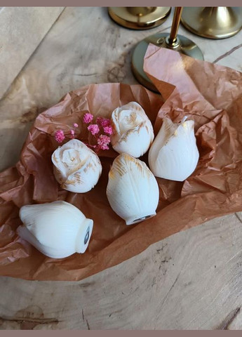 Ніжний набір свічок у формі тюльпанів – витончене доповнення до вашого декору або унікальний подарунок. 🌿 Виготовлені вручну з 100% натурального соєвого воску, ✨ Мають м’який золотистий шимер 🌸 Ароматизація – за бажанням (напишіть нам в чат) 🎨 Колір – білий натуральний або індивідуальний на замовлення 📦 В наборі 5 квітів. 🔹 Розмір однієї свічки: 3,5×5 см 🔹 Загальна вага: 135 г Свічки чудово виглядають у підсвічниках для чайних свічок або високих декоративних підставках. Всі аксесуари на фото можна придбати у нас – напишіть нам в чат 💬