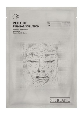Тканинна крем-маска для обличчя, що зміцнює з пептидами Peptide Firming Solution південнокорейської марки Steblanc підходить всім, особливо рекомендована для шкіри з ознаками вікових змін. М'який нетканий матеріал щільно прилягає до поверхні шкірного покриву, забезпечує глибоке проникнення кремової есенції у шари шкіри.Засіб інтенсивно зволожує, пом'якшує, живить та розгладжує шкіру, зміцнює її структуру, покращує захисні властивості епідермісу. Маска підвищує тонус, еластичність та пружність шкірного покриву, уповільнює процеси вікових змін, підтягує шкіру, усуває подразнення, лущення та сухість, розгладжує зморшки. Ключовим компонентом формули є комплекс пептидів.
