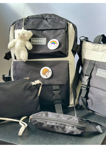 Універсальний Набір "4в1": Рюкзак, Сумка, Клатч, Пенал + Брелок – Стиль та Практичність для Кожного Дня! Представляємо неймовірно функціональний та стильний комплект, який стане вашим незамінним помічником у будь-якій ситуації – від міських прогулянок до подорожей та щоденних справ. Цей набір "4в1" включає рюкзак, сумку, клатч, пенал та милий брелок, пропонуючи максимум можливостей для організації ваших речей. _________________________________________________________________________________ Набір "4в1" – Максимум Можливостей: Рюкзак (39х29х10 см): Просторий та місткий, ідеально підходить для книг, ноутбука, спортивної форми або речей для невеликої подорожі. Забезпечує комфортне носіння завдяки регульованим лямкам. Сумка (28х27х6 см): Стильна сумка-шопер або крос-боді, чудово підійде для щоденних виходів, покупок або як додатковий аксесуар до рюкзака. Клатч (19,5х14 см): Компактний та елегантний, ідеальний для найнеобхідніших речей – телефону, ключів, карток. Можна використовувати як самостійний аксесуар для вечірнього виходу. Пенал (18х7 см): Зручний для ручок, олівців, косметики або інших дрібниць, допомагає підтримувати порядок у більшій сумці чи рюкзаку. Брелок: Милий декоративний елемент, що додає індивідуальності комплекту. Якісні Матеріали: Виготовлений з дуже щільного текстилю та поліестеру, що гарантує високу зносостійкість, довговічність та легкість у догляді. Матеріал відмінно тримає форму та стійкий до повсякденного використання. Широкий Вибір Кольорів: Комплект доступний у стильних та актуальних кольорах: блакитний, рожевий, чорний, бузковий. Ви можете обрати той, що найкраще підкреслить ваш стиль та настрій. Продуманий Декор: Дизайн комплекту доповнений різноманітними кишеньками, які забезпечують зручну організацію ваших речей. А брелок та значки додають індивідуальності та дозволяють персоналізувати ваш аксесуар. Універсальне Призначення: Цей комплект є ідеальним рішенням для міста, подорожей і щоденних справ. Завдяки своїй багатофункціональності, ви завжди матимете потрібну сумку під рукою. Оберіть комплект "4в1" та насолоджуйтесь неперевершеним поєднанням стилю, зручності та функціональності!