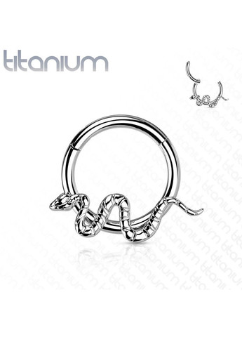 Універсальне титанове кільце із фігуркою змії. Сережки призначені для пірсингу різних частин обличчя і тіла: для проколу септуму, хряща вуха (хелікс, конч пірсинг, рук пірсинг), брови, губи, інтимного пірсингу грудей, сосків. Прикраса оснащена клікером - зручною і надійною застібкою, що защіпається, яка дозволяє легко одягати і знімати виріб. Внутрішній діаметр: 10 мм Товщина: 1,2 мм Матеріал: титан ASTM F-136 Кільце виготовлене з титанового сплаву Ti 6Al-4V ELI (ASTM F136), який використовується для створення медичних імплантів та інструментів. Сережки з цієї марки титану: -біосумісні - гіапоалергенні - дуже легкі - надзвичайно міцні - безпечні для здоров'я - можна носити щодня - термін використання не обмежений Титанові прикраси без покриття найкращі для первинного пірсингу, тому що крім згаданих переваг, титан не окислюється при контакті зі шкірою, не змінює колір, не викликає подразнення.