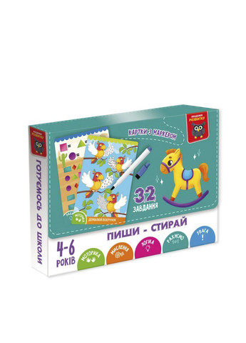 Малюйте, штрихуйте, шукайте відмінності і виконуйте безліч інших завдань! І все це разом з цікавою грою "Пиши та витирай". Комплектація: 16 ігрових полів, маркер з губкою. Упаковка: коробка Характеристики: Вага товару: 0,114 Габарити: довжина: 14,5 Габарити: ширина: 3 Габарити: висота: 21,5 Стан: нове Вікова група: Від 3 років Матеріал: Комбінований Тип: Настільна гра Колір: Різнобарвний Упаковка: Картонна коробка Вид: Розвиваючі Вік: Від 3-х років Гарантія: 14 днів Стать: унісекс Країна реєстрації бренду: Україна Країна-виробник товару: Україна