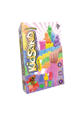 Кінетичний пісок "KidSand" (1200 г) з пісочницею. Будуйте пісочний фігури і замки в надувний пісочниці у себе вдома. Такий пісок прекрасно тримає будь-яку форму, швидко розпадається при необхідності, а його будова відрізняється одночасно пористістю і міцністю. За відчуттями такий пісок нагадує сирий морський пісок, тільки він без води, не прилипає до рук, не забруднює одяг. У наборі є 8 формочок + маса для ліплення 4-х кольорів.