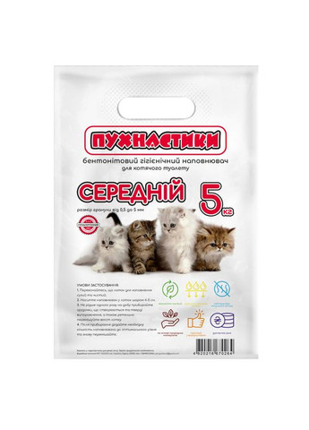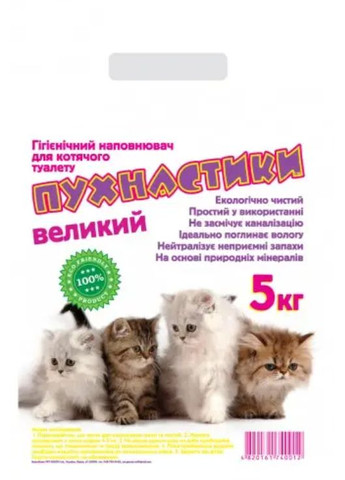 Наповнювач Пушистики, дрібний, без аромату - мінеральний гігієнічний та екологічно чистий наповнювач для котячого туалету. Переваги наповнювача: утворює великі грудочки відмінно комкується та поглинає рідину усуває неприємні запахи підходить для котів з будь-яким типом вовни Застосування наповнювача: в сухий і чистий котячий туалет насипте наповнювач шаром 4-5 см. Не рідше 1 разу на добу прибирайте грудочки, що утворилися. після збирання додайте необхідну кількість наповнювача використаний пісок слід викидати зі сміттям, не допускати попадання до каналізаційних систем.