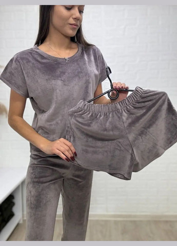 Представляємо вашій увазі напрочуд затишний і стильний жіночий комплект піжами від Lеkol. Цей комплект складається з футболки з коротким рукавом, штанів та шортів, виготовлених з м'якого велюру на бавовняній основі (плюш), що забезпечує неймовірний комфорт та затишок у будь-яку пору року.