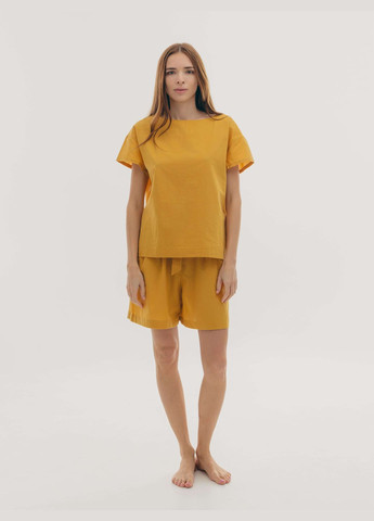 Піжама з вареної бавовни гірчичного кольору М'якенька на дотик та не потребує прасування. У комплекті шорти та футболка. Склад: 100% бавовна (варена бавовна) Вироблено в Україні На моделі розмір: S Параметри моделі: Зріст: 174 см. Об'єми: 84-60-80
