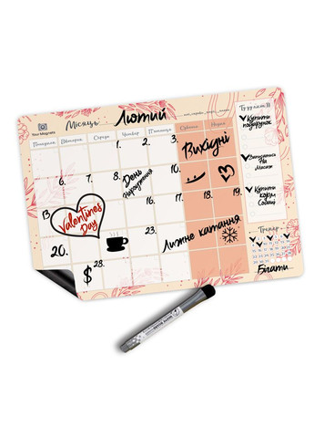 Магнітний планер Якщо планів маєш більше, ніж лежати на улюбленому дивані то у нас є для тебе ідеальний помічник. Магнітний планер на холодильник від Your Magnets стане твоїм диво засобом, який збере всі важливі справи в одному місці і не дозволить просто забути й відкласти на завтра. Прикріпи його на холодильник! Як-не-як, усі ми туди заглядаємо кілька разів на день, тож важливі пункти постійно будуть в полі зору. Як тоді ж про них забути? У кожному планері є розграфлений місяць, вказані дні тижня, окремий список для дрібних справ і трекер для відстежування звички. А найприємніше, що написи можна просто стерти губкою і планер — як новий! Спеціальний маркер з губкою у комплекті з планером :) Планер на холодильник складається з декількох блоків: планер на місяць; To-Do List; трекер звичок; Що ти будеш писати в цьому планері на холодильник? Записуй важливі плани, зустрічі, організуй робочий та сімейний розпорядок. Залишай повідомлення для сім'ї; Відзначай дні народження, свята та важливі дати, щоб нічого не забути та встигнути підготувати подарунки; Трекай звички та стеж за результатами за допомогою спеціального трекера; Детальніше про планер: Розмір: АЗ ( 295мм.х415мм.); Кути планера заокруглені; Ламінована поверхня. Доступний в 5 кольорах: GREY LILAC GREEN PEACHY BLUE Планер виготовляється на двох мовах на вибір: UA ENG Планер має магнітну основу, яка чудово кріпиться на холодильник чи іншу металеву поверхню; До кожного планера в комплект ми додаємо чорний маркер на водній основі, який ще має губку для стирання на ковпачку; Багаторазова поверхня. Пиши та стирай плани скільки завгодно; Терміни виготовлення планера: Відправка в день замовлення або на наступний робочий день, в залежності від часу оформлення замовлення. Упаковка: Кожен магнітний планер має міцне та красиве пакування, тому ідеально підійде на подарунок. Доставка: Замовити магнітний планер на холодильник можна з доставкою Новою Поштою та Укр. Поштою. На ваш вибір. Відправки здійснюємо з Пн. по Пт. Варто знати: Записи з планера можна витирати губкою на маркері або вологою ганчіркою; Не використовуйте миючі засоби та засоби які містять спирт; Маркер буде писати довше, якщо його зберігати ковпачком до низу; Використовуйте для планера тільки маркери на водній основі. Записи іншими маркерами можуть не витертись.