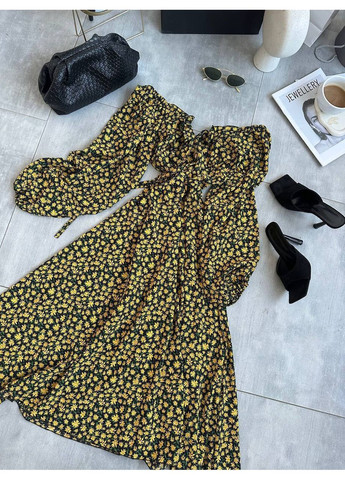 Сукня з квітковим принтом на чорному фоні, виконана з легкої та приємної до тіла тканини. Модель має довгі пишні рукави на манжетах, відкриту лінію плечей і романтичний виріз із зав’язками спереду. Спідниця вільного крою з розкльошеним силуетом, що створює жіночний та повітряний образ. Ідеальний вибір для літніх прогулянок, побачень чи відпочинку.